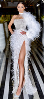 MAXI SKIRT AND CROP TOP SET 3 PARTS TRINITY SEQUIN GLITTER LACE FEATHERS SILVER WHITE AND NUDE