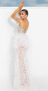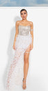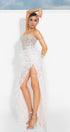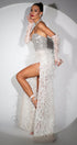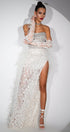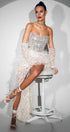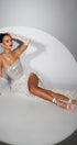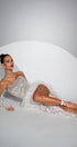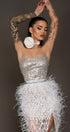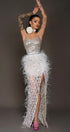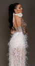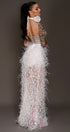 MAXI SKIRT AND CROP TOP SET ESMERALDA SEQUIN GLITTER LACE FEATHERS SILVER WHITE AND NUDE