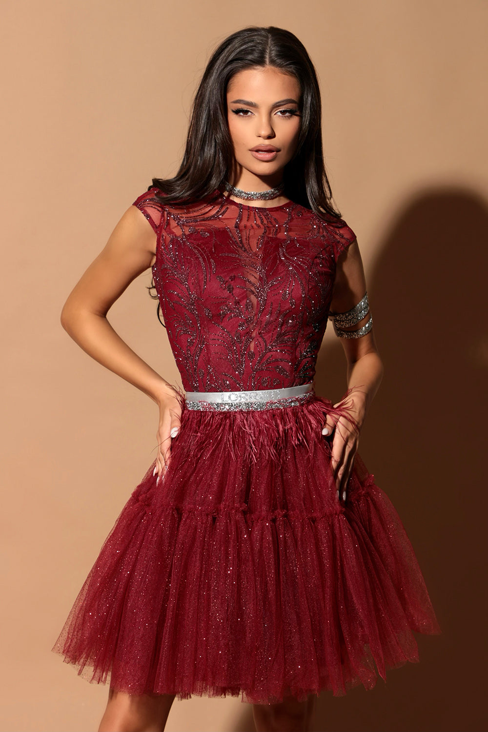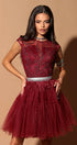 MINI SKIRT AND CROP TOP SET KARMA GLITTER LACE GLITTER TULLE BURGUNDY
