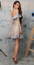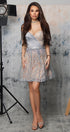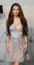 MINI SKIRT AND CROP TOP SET MILANA GLITTER LACE SATIN SILVER AND NUDE