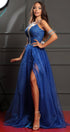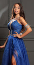 MAXI SKIRT AND CROP TOP SET CANDICE GLITTER LACE RHINESTONE GLITTER TULLE COBALT BLUE