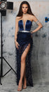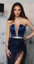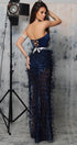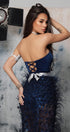MAXI SKIRT AND CROP TOP SET EMMANUELLE SATIN RHINESTONE GLITTER LACE FEATHERS DARK BLUE