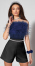 MINI CROP TOP FEATHERS SATIN DARK BLUE