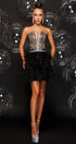 MINI SKIRT AND CROP TOP SET GIA GLITTER LACE RHINESTONE FEATHERS BLACK AND NUDE