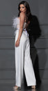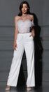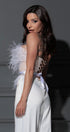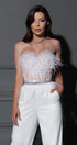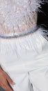 MAXI CROP TOP AND PANTS SET LILLIE GLITTER LACE FEATHERS SATIN WHITE AND NUDE