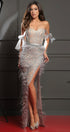 MAXI SKIRT AND CROP TOP SET LESLIE GLITTER LACE FEATHERS SILVER AND NUDE