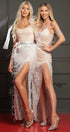 MAXI SKIRT AND CROP TOP SET MELVINA GLITTER LACE FEATHERS WHITE AND NUDE