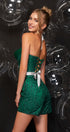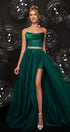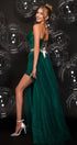 ДЪЛЪГ СЕТ ТОП С ПАНТАЛОН И ШЛЕЙФ CARMELLA ДАНТЕЛА ГЛИТЕР САТЕН ТЮЛ БРОКАТ ТЪМНО ЗЕЛЕН
