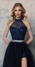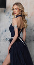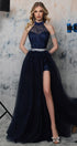 ДЪЛЪГ СЕТ ТОП С ПАНТАЛОН И ШЛЕЙФ ELSIE ДАНТЕЛА ГЛИТЕР ТЮЛ БРОКАТ ТЪМНО СИН