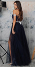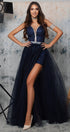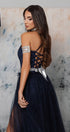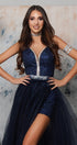 ДЪЛЪГ СЕТ ТОП С ПАНТАЛОН И ШЛЕЙФ FIORELLA ДАНТЕЛА ГЛИТЕР КАМЪНИ ТЮЛ БРОКАТ ТЪМНО СИН