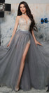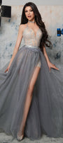 ДЪЛЪГ СЕТ ТОП С ПАНТАЛОН И ШЛЕЙФ STEPHANIE ДАНТЕЛА ГЛИТЕР ТЮЛ БРОКАТ СРЕБЪРЕН С НЮД