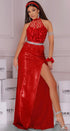 ДЪЛЪГ СЕТ 2 ЧАСТИ ТОП С ПОЛА NIKKIE ДАНТЕЛА ТРИКО ЛАМЕ ЧЕРВЕН