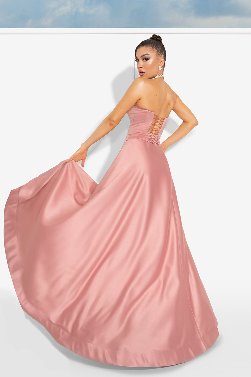 Моля, не поставяйте роклята в пералня с центрофуга или в сушилня, както и не прилагайте агресивно третиране, за да запазите нейния луксозен силует и качество.