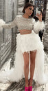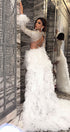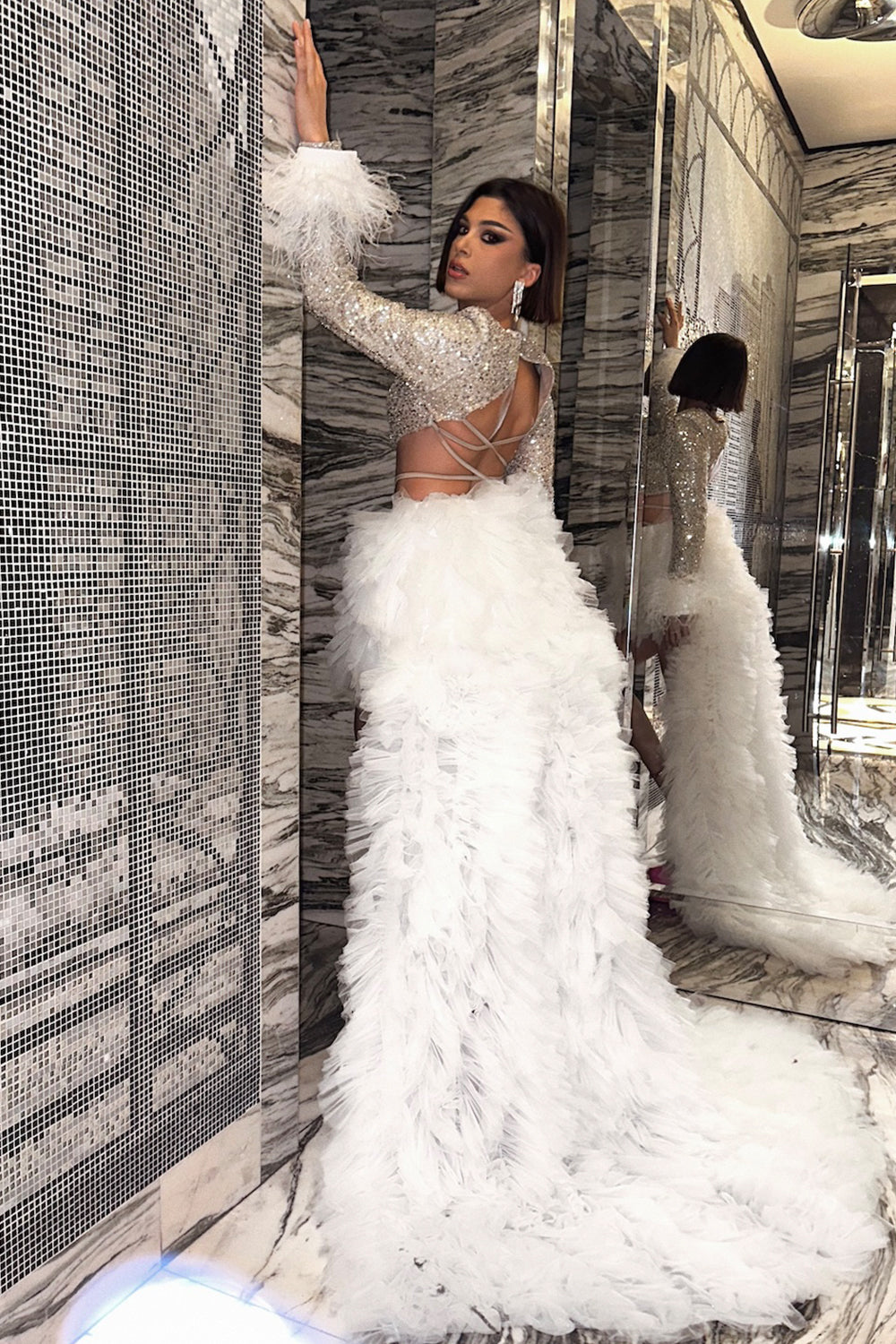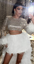 ДЪЛЪГ СЕТ 4 ЧАСТИ ТОП С ПОЛА ALEXIS ПАЙЕТИ ПЕРА ТЮЛ БЯЛ СЪС СРЕБЪРЕН