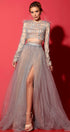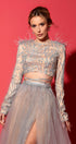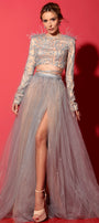 ДЪЛЪГ СЕТ ТОП С ПОЛА ADARA ДАНТЕЛА ГЛИТЕР ПЕРА КАМЪНИ ТЮЛ БРОКАТ СРЕБЪРЕН С НЮД