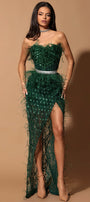 ДЪЛЪГ СЕТ ТОП С ПОЛА FEATHER PRINCESS ДАНТЕЛА ГЛИТЕР ПЕРА ТЪМНО ЗЕЛЕН