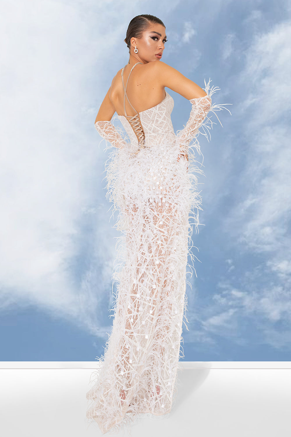 ДЪЛЪГ СЕТ 3 ЧАСТИ ТОП С ПОЛА HANNAH ДАНТЕЛА ГЛИТЕР ПЕРА БЯЛ С НЮД