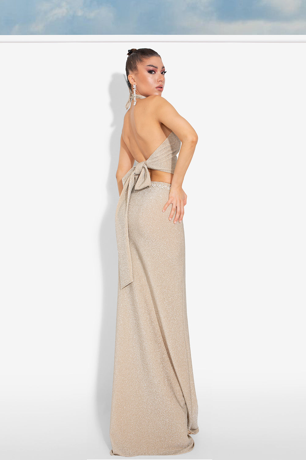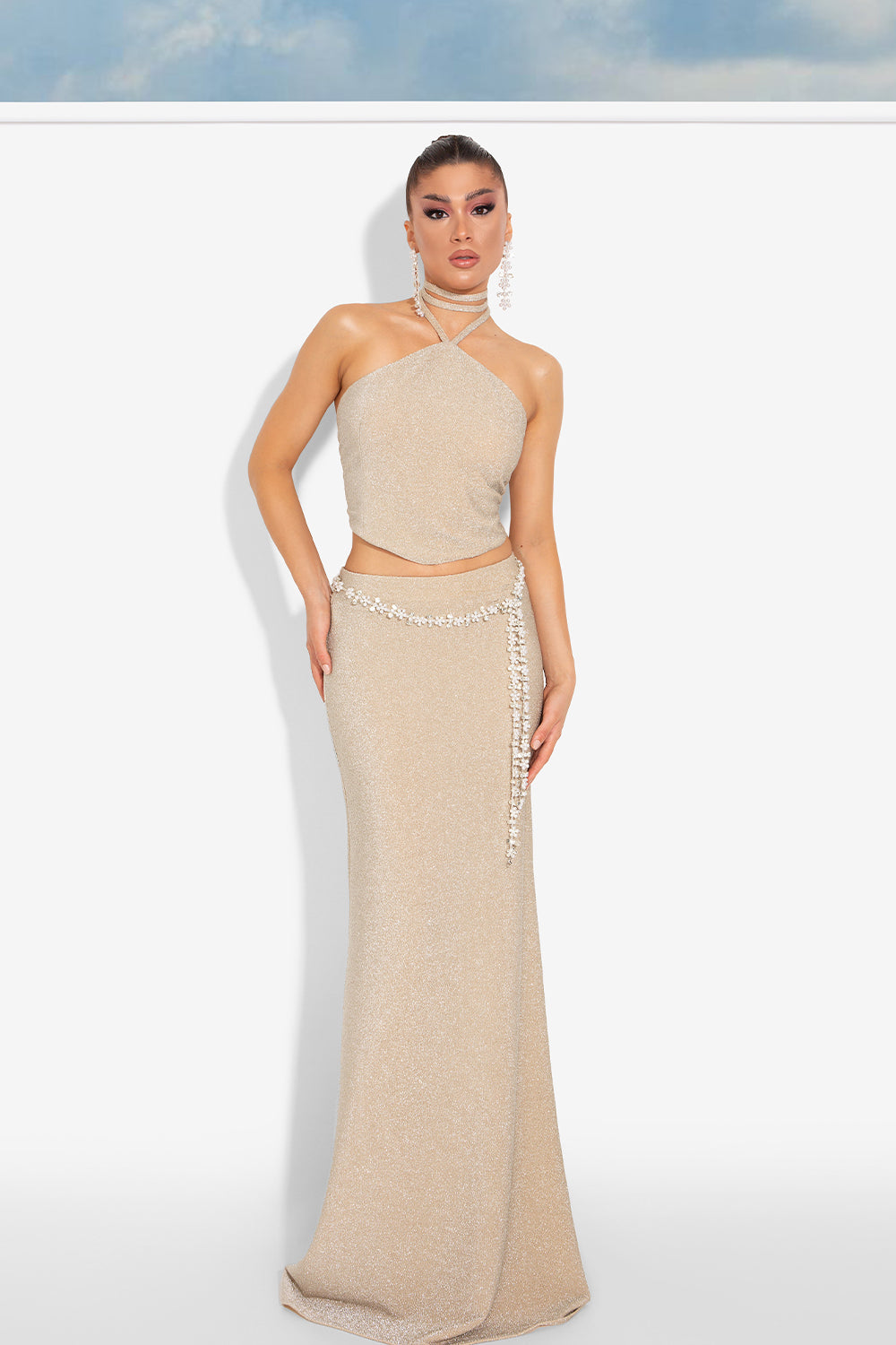 ДЪЛЪГ СЕТ 2 ЧАСТИ ТОП С ПОЛА HENLEY ЛАМЕ ЗЛАТЕН