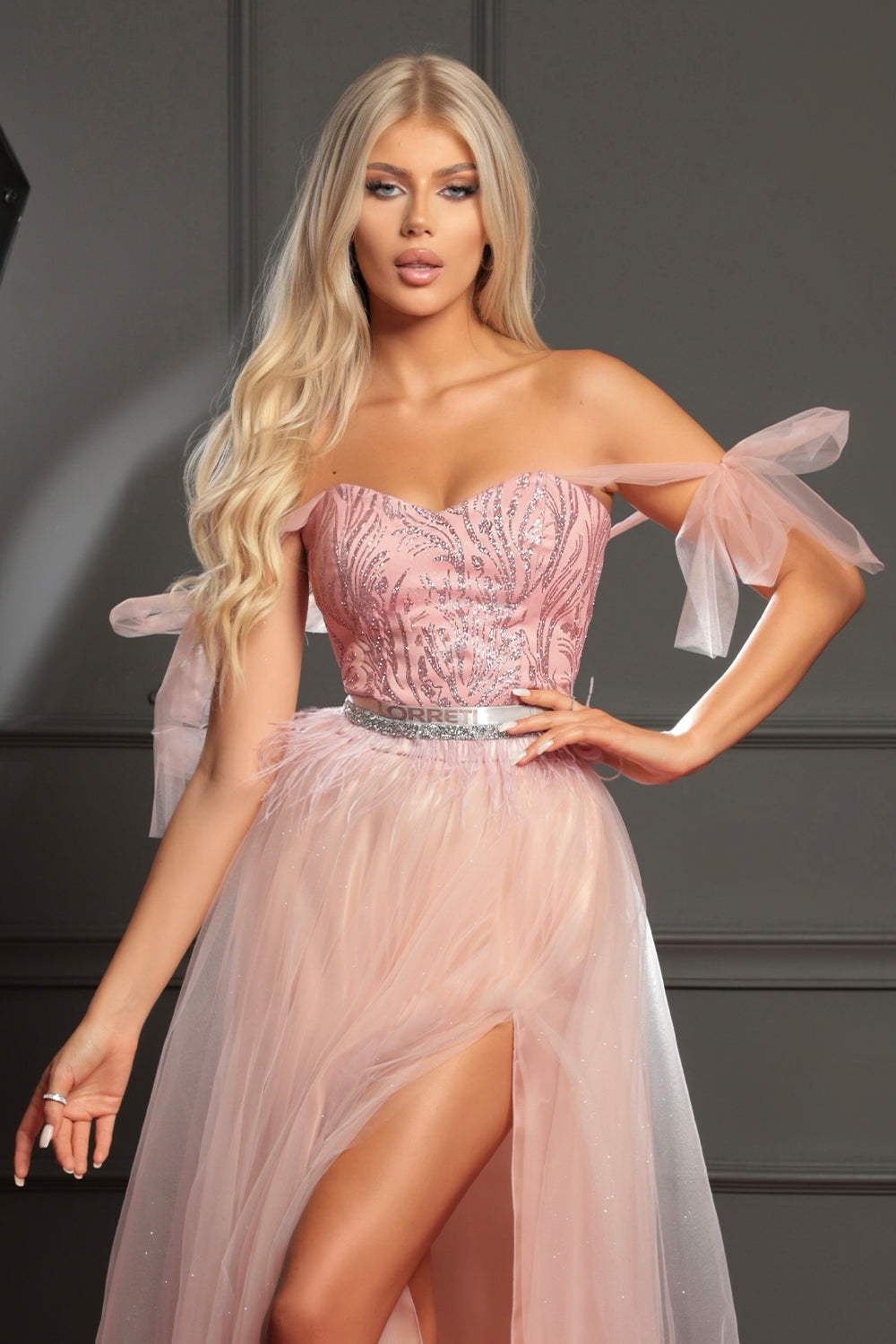 ДЪЛЪГ СЕТ ТОП С ПОЛА YASMINE ДАНТЕЛА ГЛИТЕР ТЮЛ БРОКАТ ПУДРА