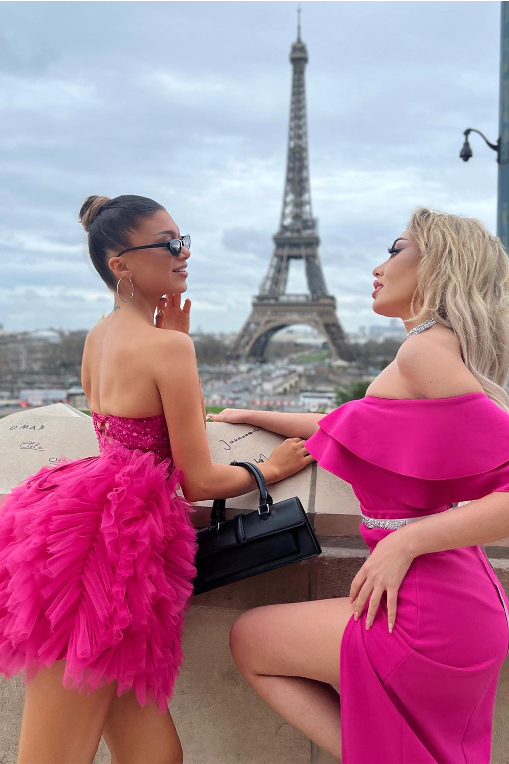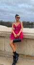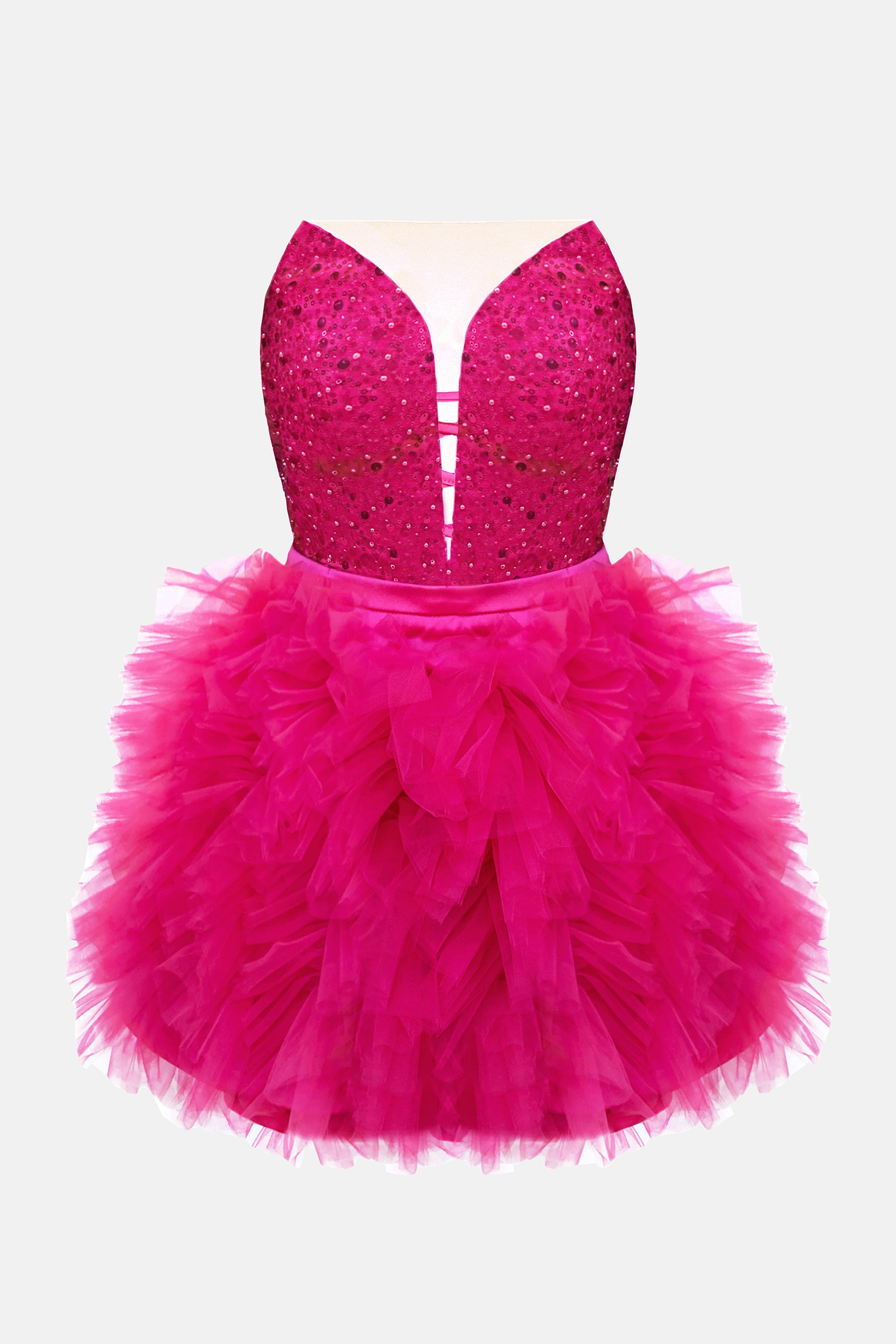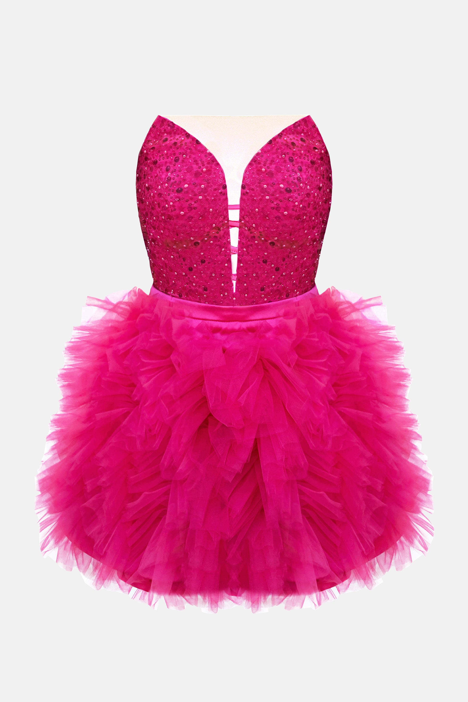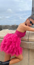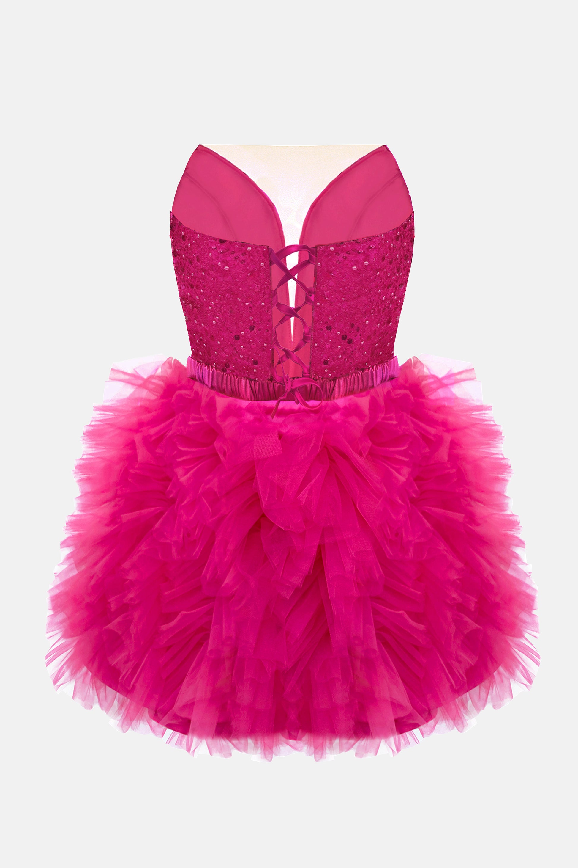 МИНИ СЕТ ТОП С ПОЛА AMORE ПАЙЕТИ ТЮЛ ЯРКО РОЗОВ